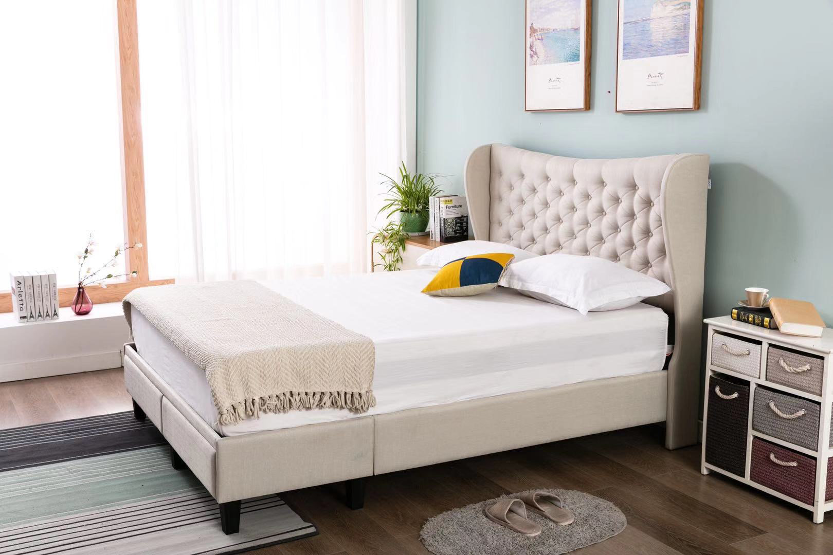 Zinus athena upholstered tufted wingback platform bed. Inspire sweet dreams with this queen upholstered platform bed. Storage rails and footboard are included to ensure maximum versatility, and the bed comes with full slats, so you can use it without a box spring. Charmingly designed with grace and distinction, this queen platform bed comes with an upholstered polyester fabric base and tufted headboard, solid wood legs and a slatted wood support system that eliminates the need for a box spring. The bed frame features thick side rails and wooden slats that eliminate the need for a.